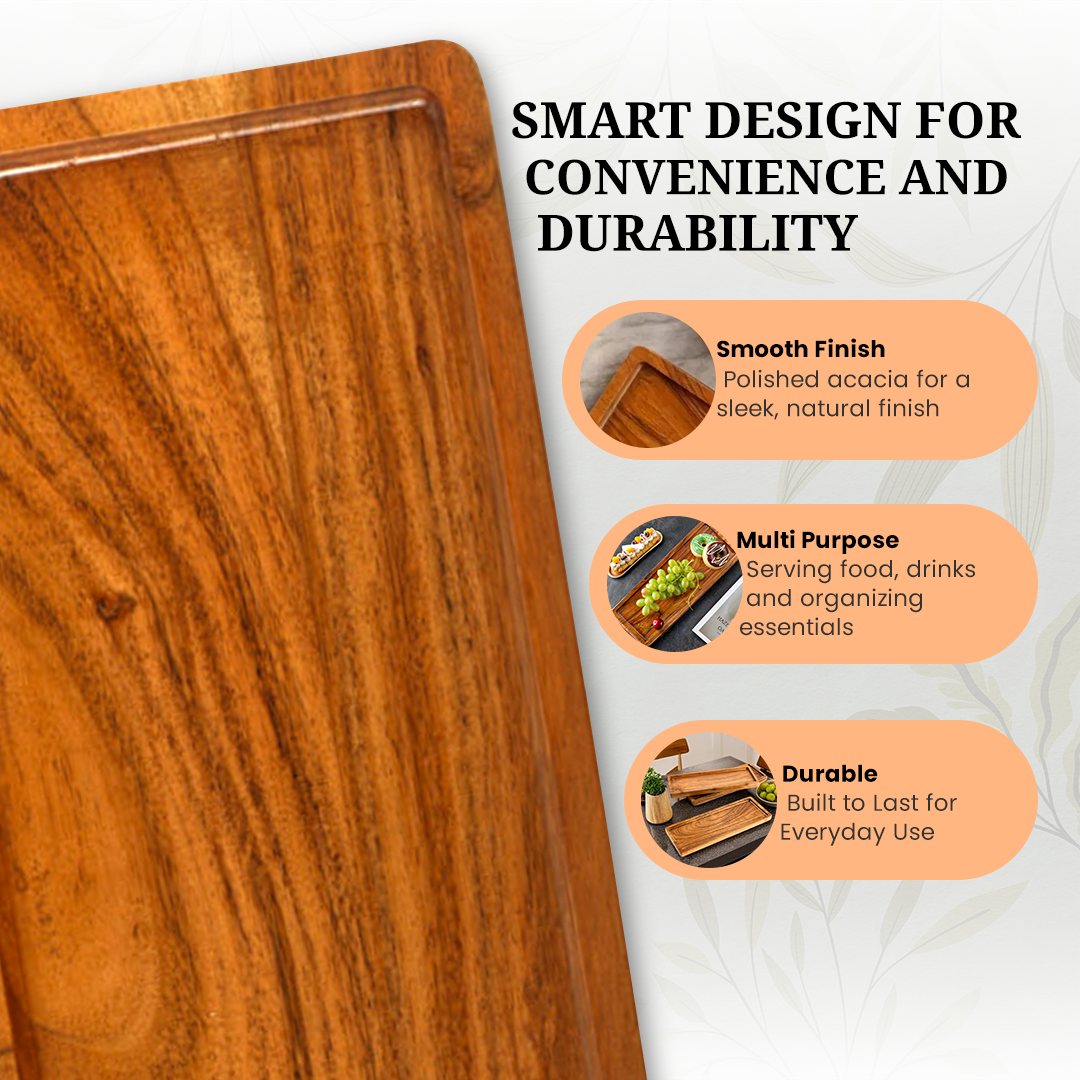 Each tray is polished to a smooth finish and coated with a food-safe protective layer, offering durability and ease of cleaning. These multi-functional wooden trays are perfect for serving or displaying items.