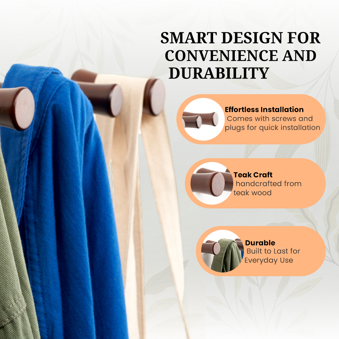 Teak Wood Craftsmanship: Crafted from premium teak wood, these hooks are not only beautiful but also durable. They're designed to last and bring a natural, organic warmth to your home.